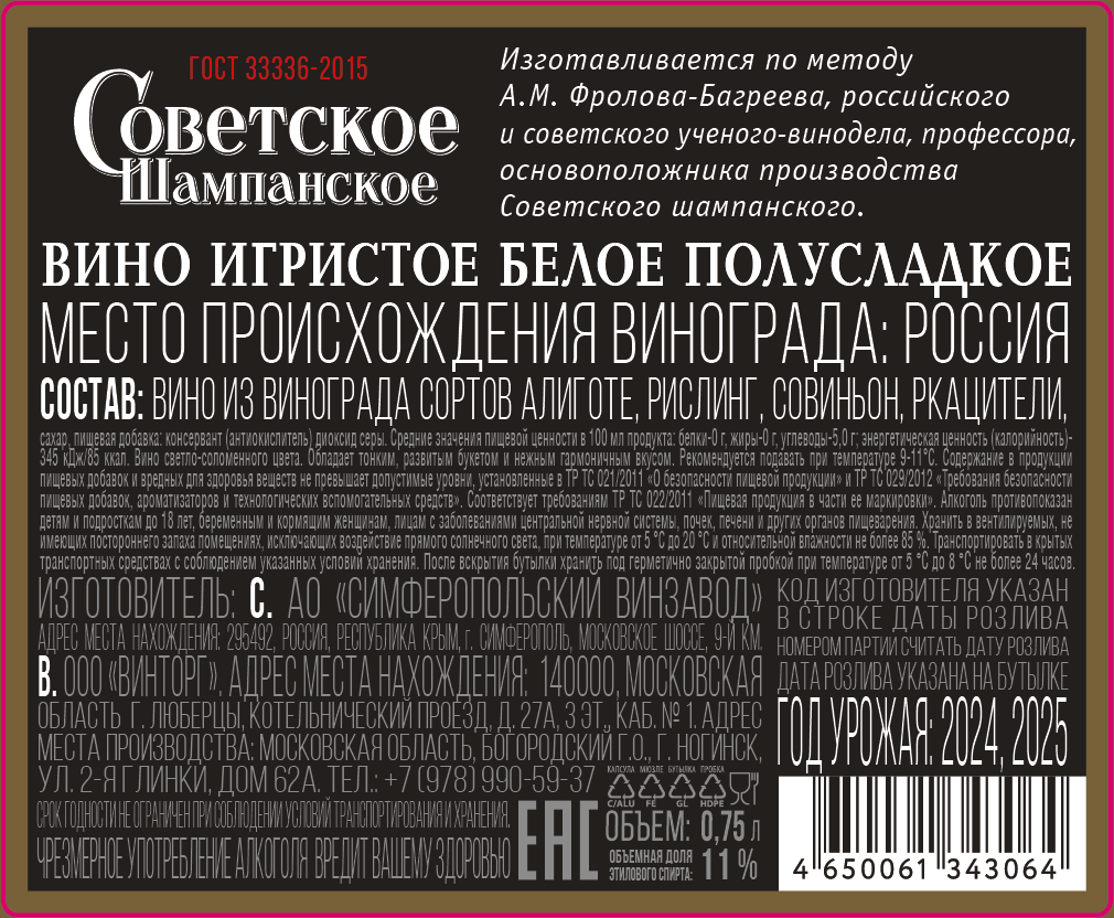 Обладает тонким, развитым букетом и нежным гармоничным вкусом. Рекомендуемая температура употребления 9–11 °С. Сорта винограда: Алиготе, Подарок Магарача,Бианка. Место Происхождения винограда: Россия, Северо-Кавказский Федеральный Округ
