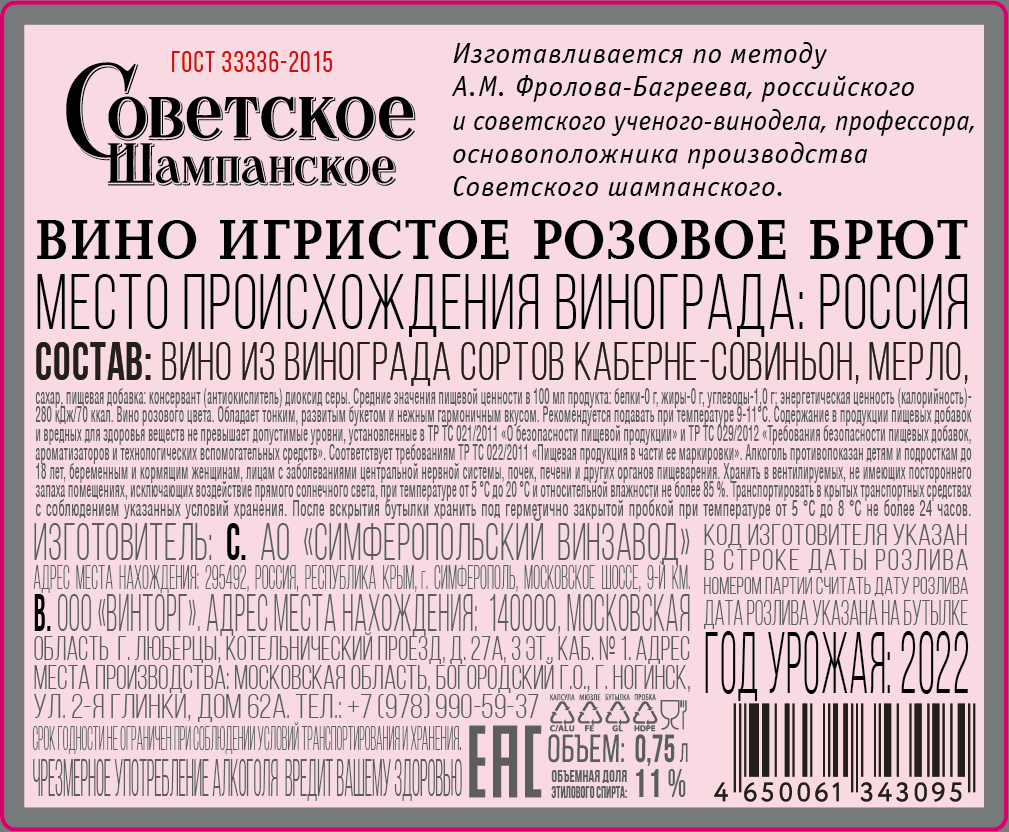 Обладает тонким, развитым букетом и нежным гармоничным вкусом. Сорта винограда: Алиготе, Подарок Магарача, Бианка, Мерло. Рекомендуемая температура употребления 9 – 11 °С.Северо-Кавказский Федеральный Округ.