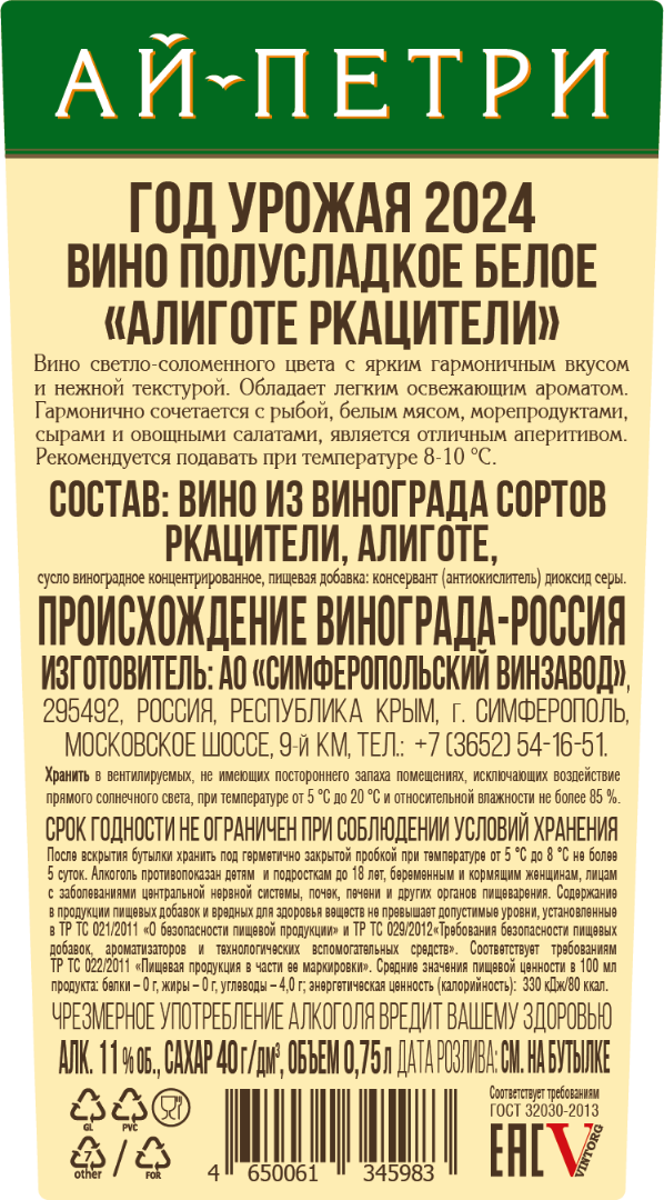 АЛК. 11 % ОБ., САХАР 40 Г/ДМ3, ОБЪЕМ 0,75Л ГОД УРОЖАЯ 2024