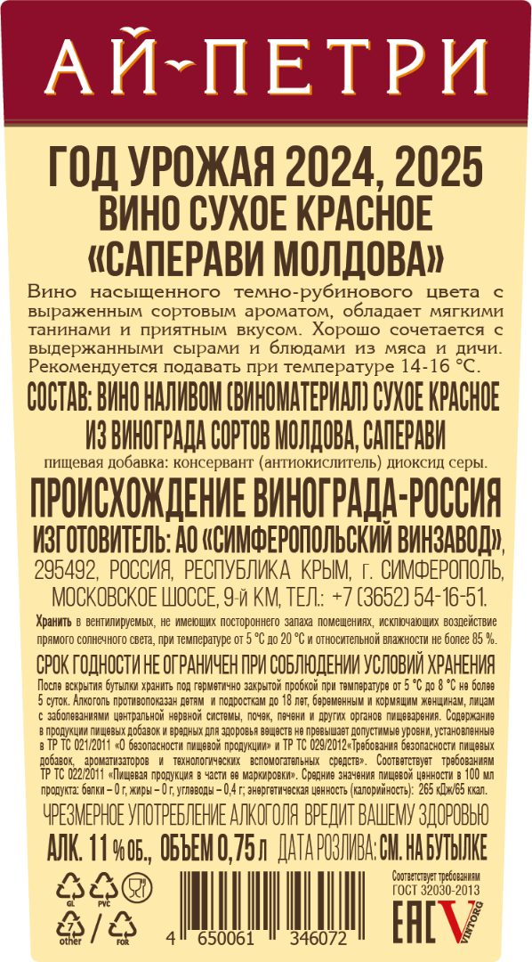 ПРОИЗВЕДЕНО ИЗ ВИНОГРАДА, ВЫРАЩЕННОГО НА ТЕРРИТОРИИ ЮЖНОГО ФЕДЕРАЛЬНОГО ОКРУГА.
