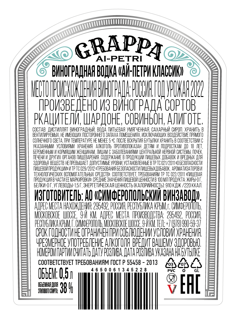 ВИНОГРАДНАЯ ВОДКА «АЙ-ПЕТРИ КЛАССИК» ПРОИЗВЕДЕНО ИЗ ВИНОГРАДА СОРТОВ РКАЦИТЕЛИ, ШАРДОНЕ, СИЛЬВАНЕР, ФЕТЯСКА, АЛИГОТЕ, СОВИНЬОН, ВЫРАЩЕННОГО НА ТЕРРИТОРИИ ЮЖНОГО ФЕДЕРАЛЬНОГО ОКРУГА. ГОД УРОЖАЯ: 2021. СОСТАВ: дистиллят виноградный, вода питьевая умягченная, сахарный сироп.